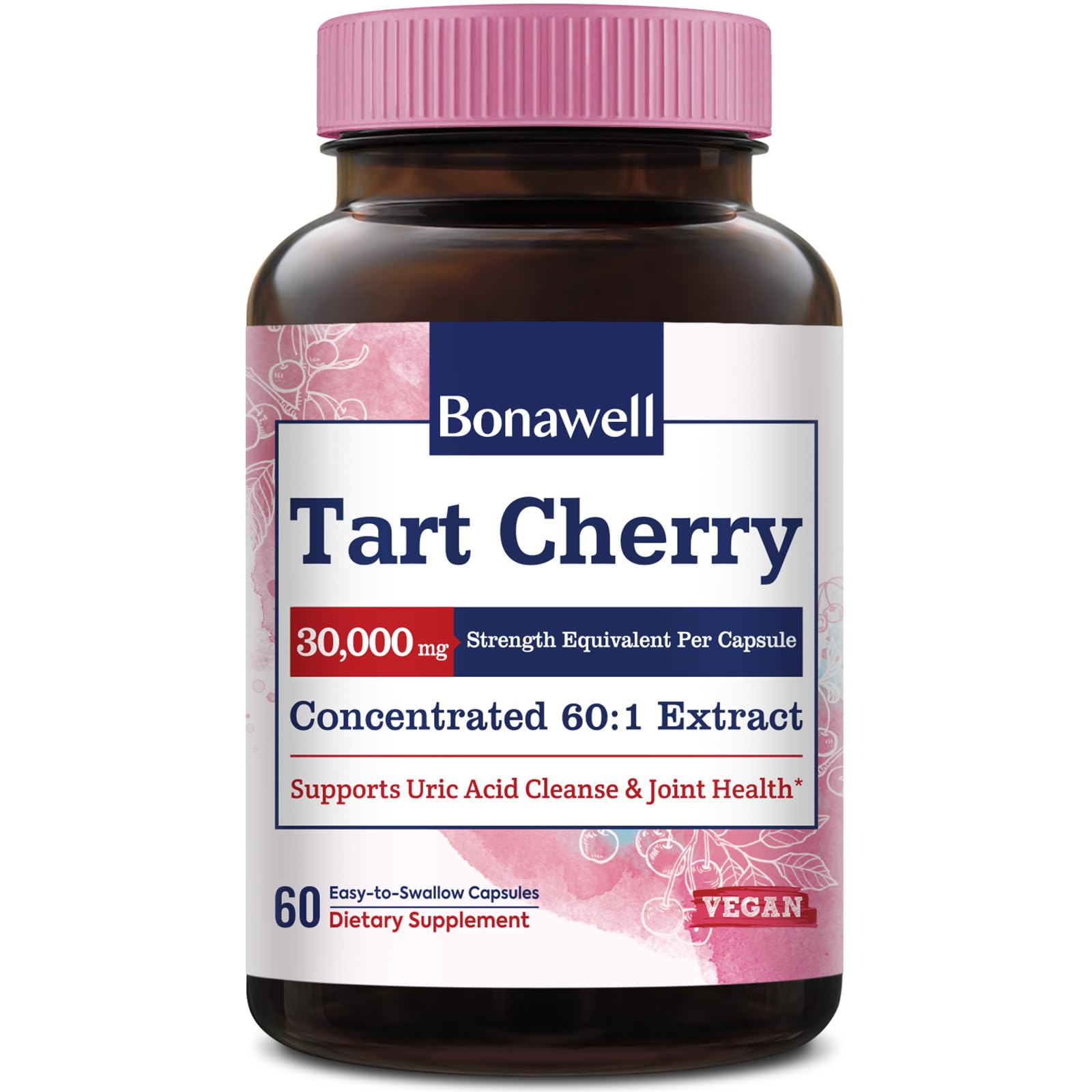 Bonawell's Tart Cherry 500 mg capsules pack a powerful punch with a 60:1 extract concentration, giving you the equivalent of 30,000 mg of fresh cherries—all in a convenient capsule.